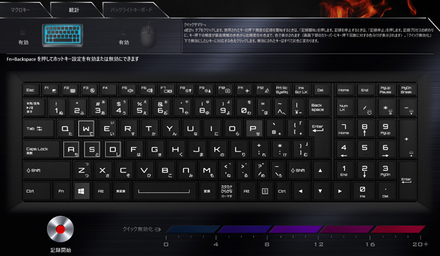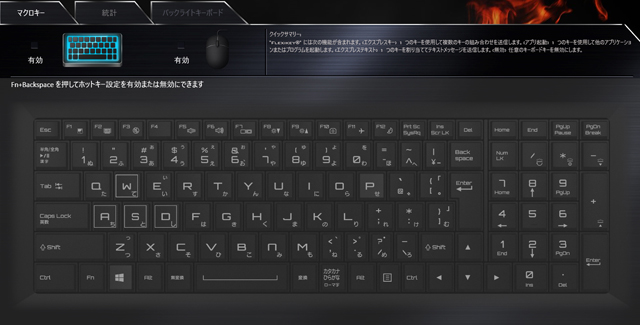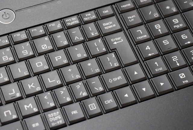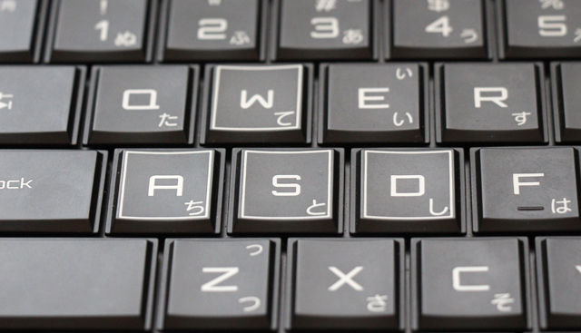 なのでゲームノートの場合、キーボード周辺の使いやすさは結構重要です。 Lev-17FG098-i7K-VEでは一応、WASDキーに特殊な印字がなされてはいるものの、プログラマブルキー等のゲーム用のキーは用意されていません。 しかし、専用のソフトウェアが搭載されており、そのソフトを利用してキーのマクロ登録を行ったり、 バックライトのカラー設定などを行う事ができます。 というわけで以下、ソフトウェアの機能を含めたキーボードの使い勝手をチェックしてみたいと思います。 Lev-17FG098-i7K-VEの製品ページはこちら 打鍵感に優れたキーボードを採用 入力作業も快適