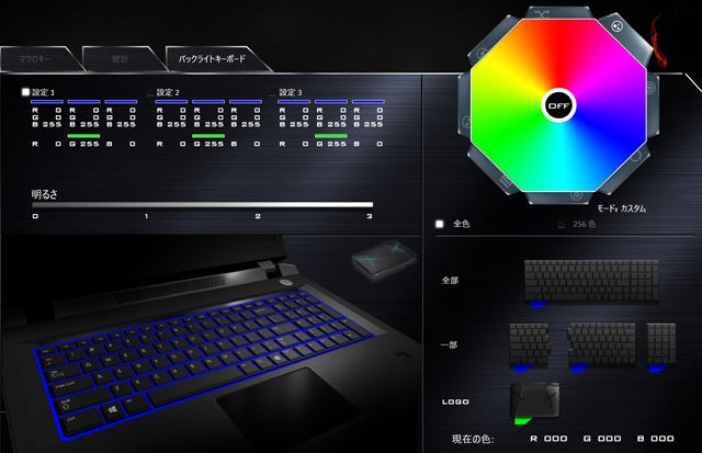 キーボードバックライトのカラー・テンポ調整なども全てこのソフトウェアで行う事ができます。 このソフト、遊ぶゲームにもよりますけど、あるのとないのとでは快適度が全然違います。繰り返しのキー入力が多いゲームでは、無くてはなりません。