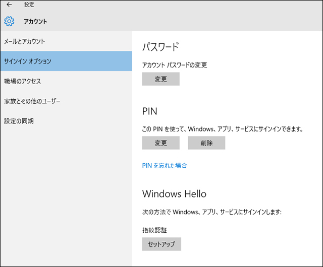 Windows 10の設定 → アカウント → サインインオプションというメニューの中に、 Windows Helloの設定があります。