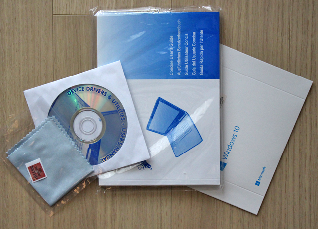 Lev-17FG098-i7K-VEの主な付属品。 左から2つ目のメディアがドライバ&アプリケーションのメディア、一番右端にあるのがWindows 10のインストールメディアです。 OEM版OSを採用したPCだと多くの場合はメディアが付属しませんし、入手するにしても別料金となってしまいますが、 今回のようにDSP版OS(PCパーツと同時に購入する事で安く入手できるOS)採用のモデルならば、リカバリメディアなどを作成する必要がないなど扱いが楽です。