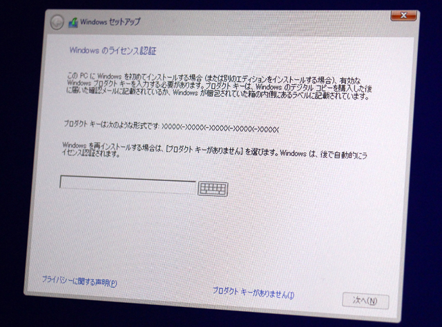 Windowsのライセンス認証画面が表示されますが、後で自動的に認証されるため、プロダクトキーがありませんを選択します(する必要がある場合もあります)。