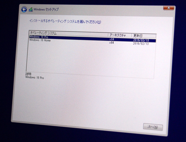 Windowsのセットアップが表示されました。 選択内容を確認し、良ければ次へ進みます。