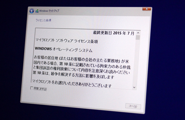 同意しますのチェックボックスをオンにし、次へ進みます。