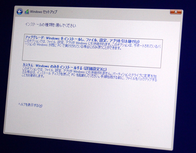 インストールの種類を選びます。 今回は下のカスタムをクリック。