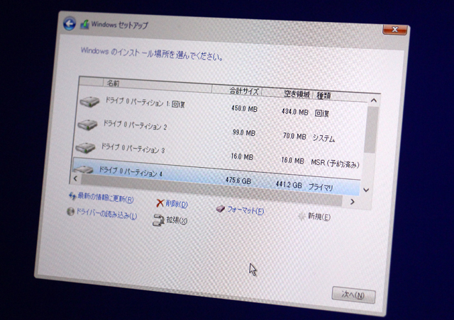 Windowsをインストールする場所を選びます。 今回は、元々OSがインストールされていたプライマリディスクを選択。