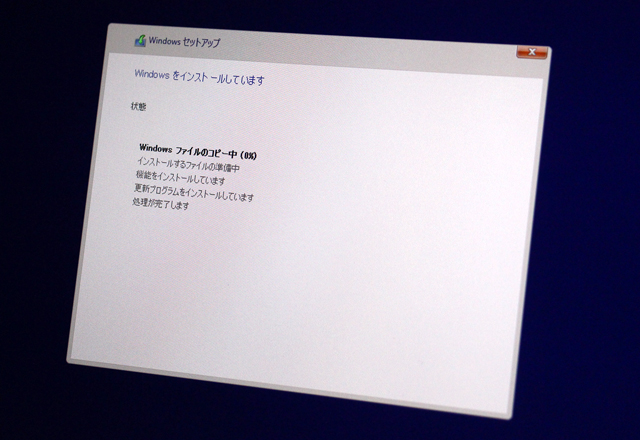 Windowsのインストールが開始されました。 この後何度か再起動を繰り返しながらインストール作業が続くため、しばらく放っておきます。